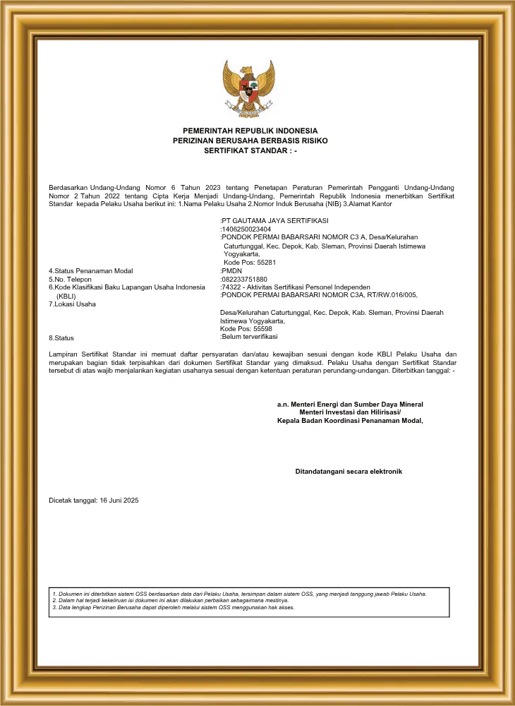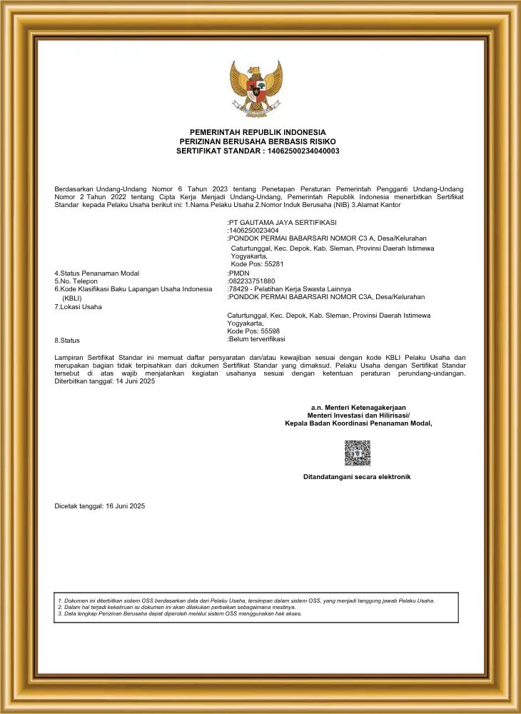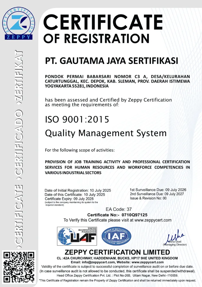 Kami hadir sebagai mitra terpercaya bagi individu, perusahaan, maupun institusi, yang membutuhkan layanan pelatihan, sertifikasi profesi, dan pengakuan kompetensi secara independen dan terverifikasi. Dengan pengalaman dan pendekatan yang adaptif, kami percaya bahwa kompetensi bukan hanya formalitas, tapi fondasi penting untuk tumbuh dan bersaing. Dengan komitmen pada kualitas, integritas, dan keberlanjutan, PT Gautama Jaya Sertifikasi siap menjadi mitra strategis Anda dalam menciptakan tenaga kerja yang kompeten, tersertifikasi, dan siap menghadapi tantangan industri masa kini dan masa depan. Bersama kami, jadikan kompetensi sebagai langkah nyata menuju keunggulan dan daya saing.